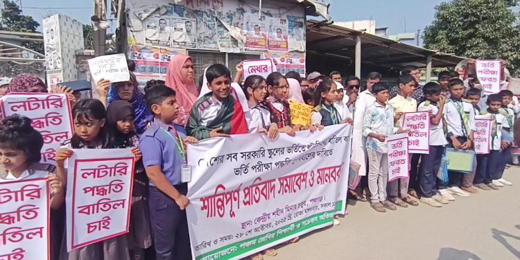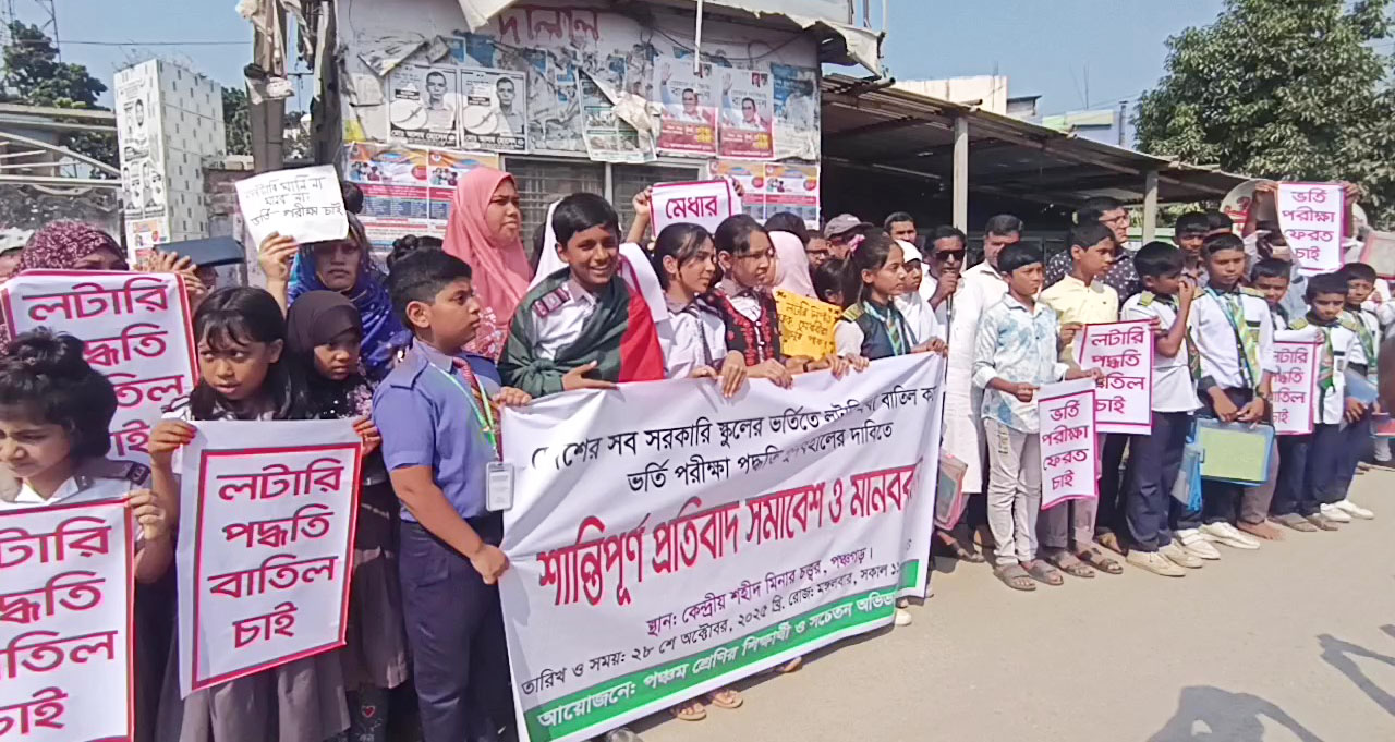 People in Panchagarh made a human chain to call for the end of the lottery-based admission system in government schools and the return of merit-based entrance exams. The protest took place on 28 October, tuesday afternoon outside the Central Shaheed Minar along the Dhaka–Banglabandha expressway. It lasted an hour and included teachers, pupils, and parents from several kindergartens.
